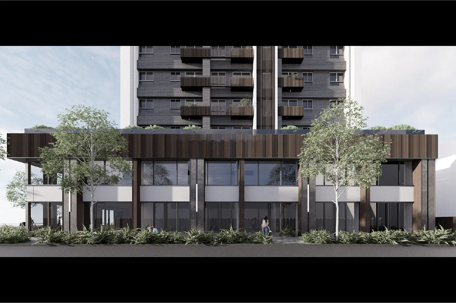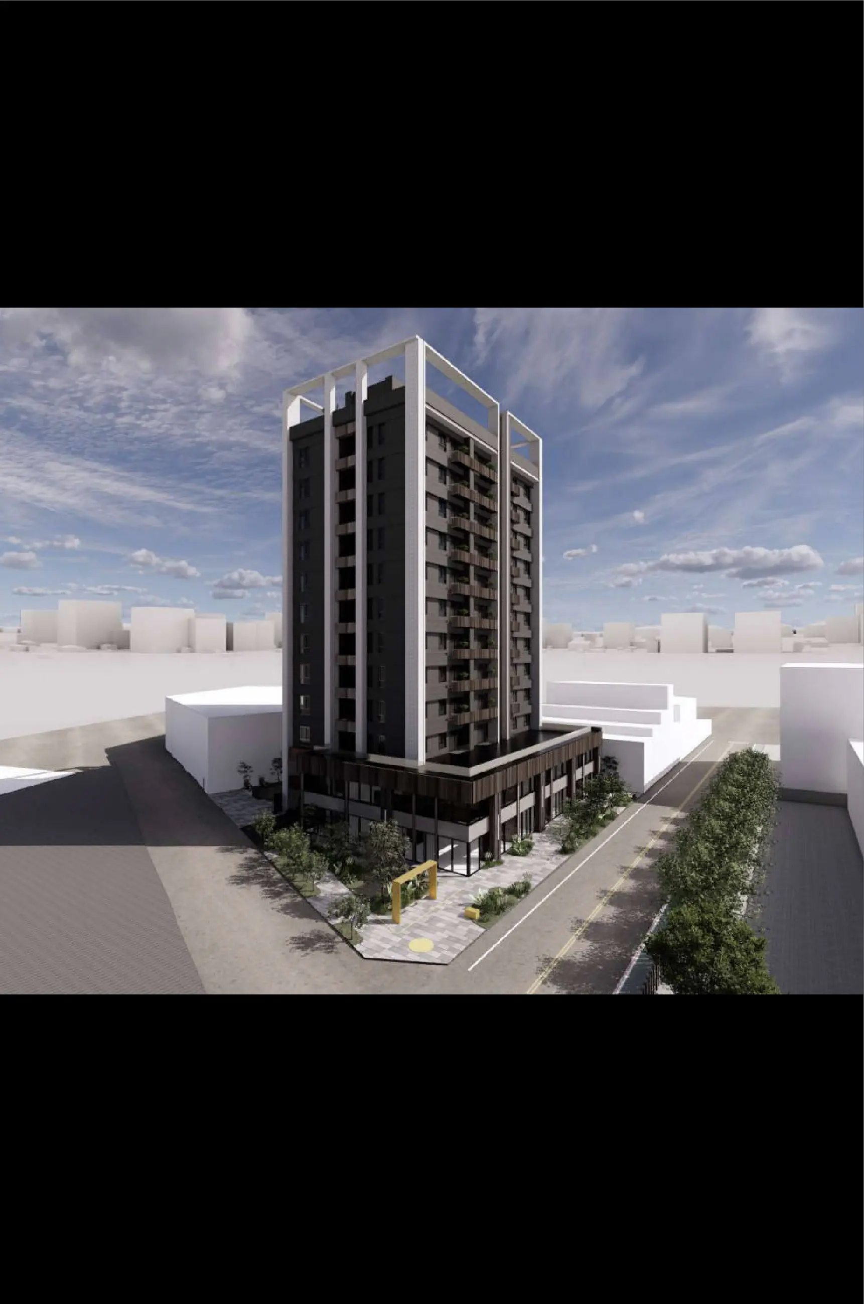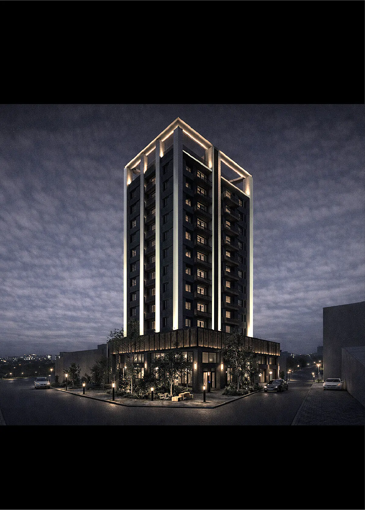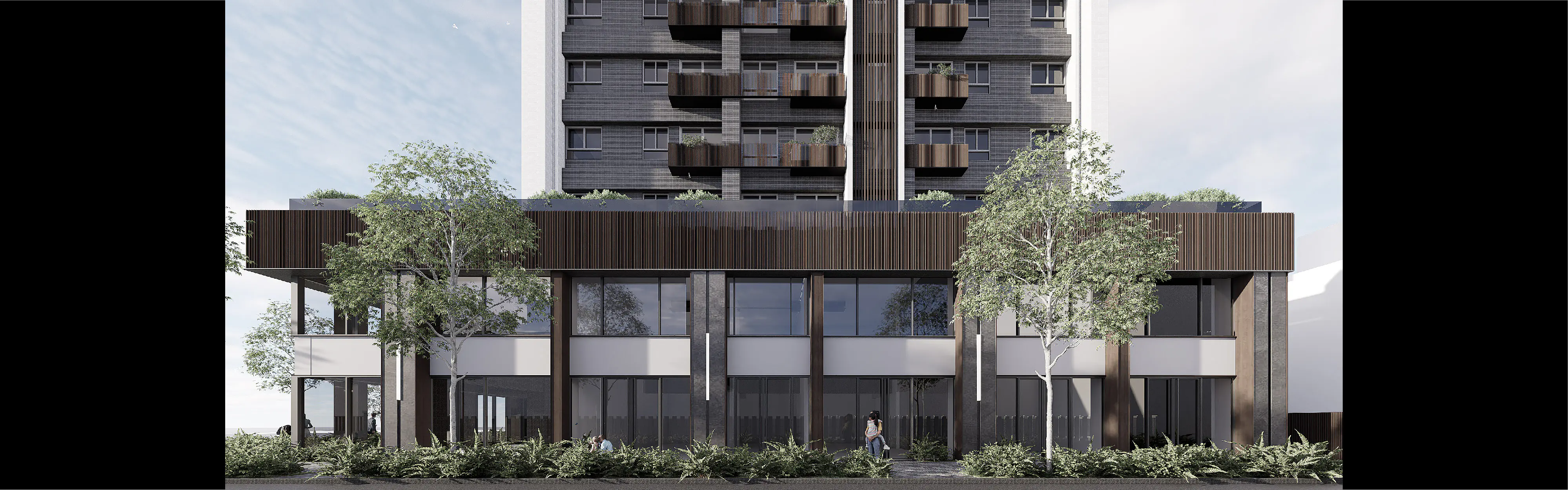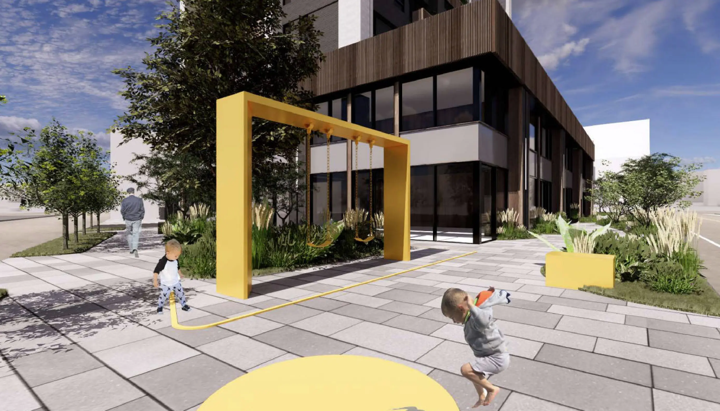The corner condition is deliberately activated with seating, greenery, and play elements facing the school. This forms a daily node for pause and interaction, offering a shared platform where residents and neighbors can naturally encounter one another.